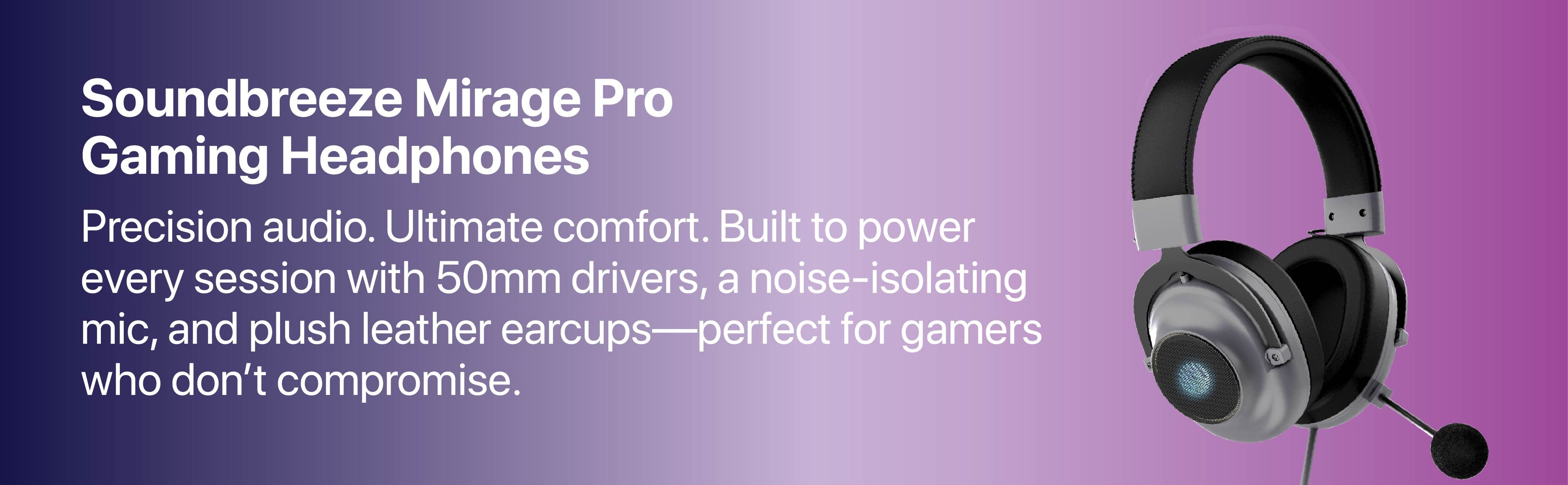 Crafted with a robust combination of aluminium and ABS, the Soundbreeze Mirage Pro is designed to withstand intense gaming sessions. Featuring leather earcups for maximum comfort and sleek LED logo lighting for a touch of flair, this headset is built for serious gamers.