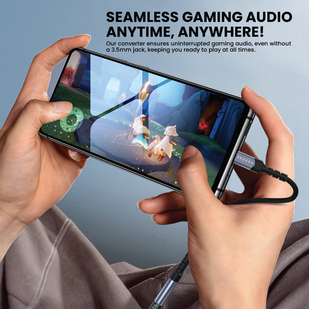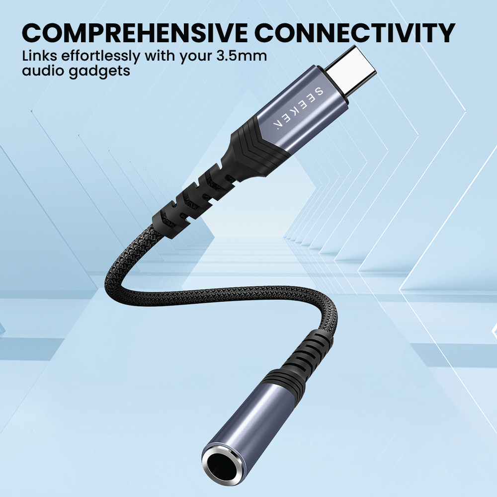 The Type-C Converter (C to 3.5mm audio jack) offers versatile connectivity with AUX and Type-C input, a durable braided cable for longevity, and the convenience of in-line controls for seamless music enjoyment.